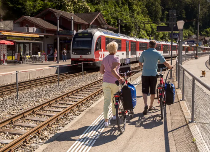 Auch hier glänzt die Schweiz mit Vorbildcharakter: Es gibt kaum ein besser ausgebautes öffentliches Nahverkehrs-Netz. Wenn Ihnen auf einer gewissen Etappe die Lust zu radeln fehlt oder das Wetter nicht mitspielt, können Sie auf der gesamten Strecke auf Bus, Bahn und abschnittsweise auch das Schiff umsteigen. Fahrräder werden teilweise in den Postbussen mitgenommen.