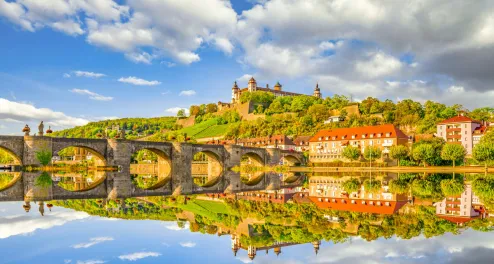 Dem Main weiter folgend, erradeln Sie sich über Ochsenfurt die alte Bischofsstadt Würzburg. Sie ist bekannt für ihre beeindruckende Barockarchitektur, darunter die Residenz, die zum UNESCO-Welterbe gehört. Sie gilt als eines der schönsten Barockschlösser Europas und beeindruckt mit ihren prachtvollen Räumen und dem wunderschön angelegten Hofgarten. Ebenso ist die Festung Marienberg auf einer Landzunge oberhalb des Mains einen Besuch wert. Zahlreiche traditionelle Weinstuben laden nach einem Erkundungsspaziergang dazu ein, fränkische Weine und lokale Spezialitäten zu genießen.