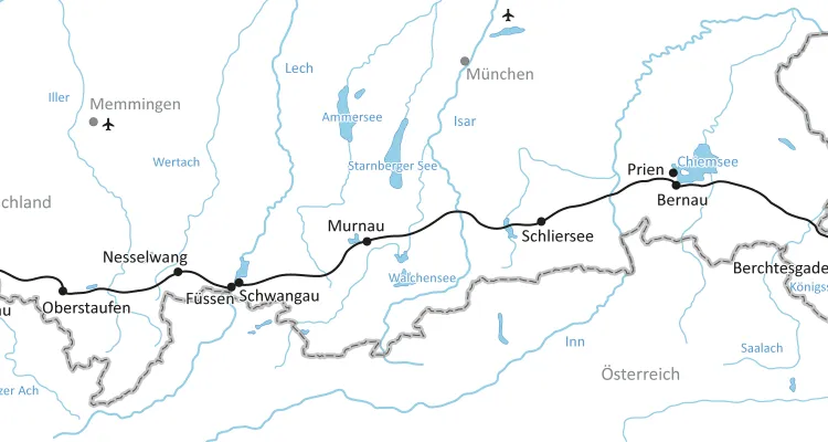 Der Bodensee-Königssee-Radweg führt durch abwechslungsreiche Landschaften voller kultureller und natürlicher Highlights. Sie starten in der historischen Inselstadt Lindau am Bodensee und radeln durch das Allgäu, vorbei an charmanten Orten wie Nesselwang und Neubeuern. Die beeindruckenden Königsschlösser bei Füssen und die malerischen Seen wie der Tegernsee, der Staffelsee und der Chiemsee sind Highlights, die jede Etappe zu einem Erlebnis machen. Am Königssee erwartet Sie eine der schönsten Bergkulissen Deutschlands.