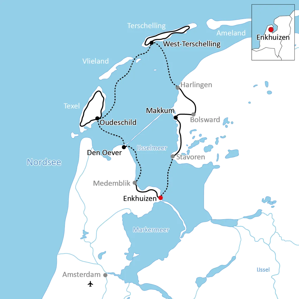 Nachdem Sie die Nacht im Hafen von Makkum verbracht haben, schwingen Sie sich heute ein letztes Mal auf Ihr Rad: Die Tour nach Stavoren führt Sie zunächst in den kleinen Ort Hindeloopen. Mit nicht einmal 1000 Einwohnern gehört er dennoch zu den elf friesischen Städten. Ehrwürdige Kapitänshäuser erzählen die Geschichte von den Glanzzeiten der niederländischen Handelskolonien. Anschließend können Sie wählen: Entweder Sie radeln auf direktem Weg entlang der Küste nach Stavoren oder Sie währen den lohnenswerten Umweg zu den friesischen Seen. In Stavoren werden die Segel wieder gesetzt – Ziel ist Enkhuizen.