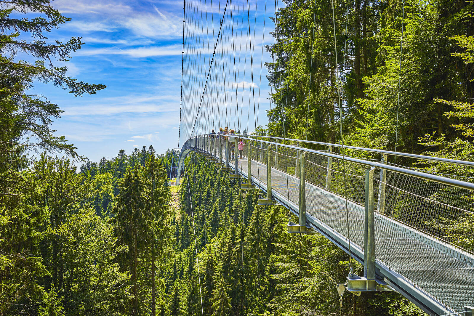 Der Tag beginnt mit einer Fahrt in der Sommerbergbahn. Oben auf dem Hochplateau angekommen, lohnt es sich, das Rad für einen Moment stehen zu lassen. Der Baumwipfelpfad und die spektakulär geschwungene Hängebrücke WildLine eröffnen beeindruckende Ausblicke auf die sanften Hügel und tiefen Täler des Nordschwarzwalds. Danach geht es weiter auf dem Schwarzwald-Panorama-Radweg – vorbei an der mystisch wirkenden Hochmoorlandschaft am Kaltenbronn – bis nach Freudenstadt.