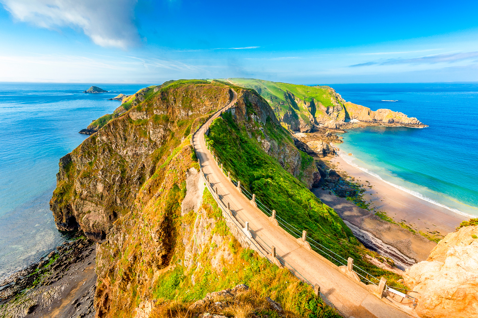 Die Räder bleiben stehen und Sie fahren mit der Fähre auf die kleine Insel Sark. Genießen Sie die Reise in die Vergangenheit. Auf der Insel fahren keine Autos und es gibt keine Straßenbeleuchtung. Entdecken Sie die kleine felsige Insel zu Fuß, was bei einer Größe von 5,5 km² kein Problem ist. Kleine Waldstücke und saftige Wiesen im Inneren und die zerklüftete Felsküste mit Sand- und Kiesbuchten lassen sich auch wunderbar mit der Pferdekutsche erkunden.