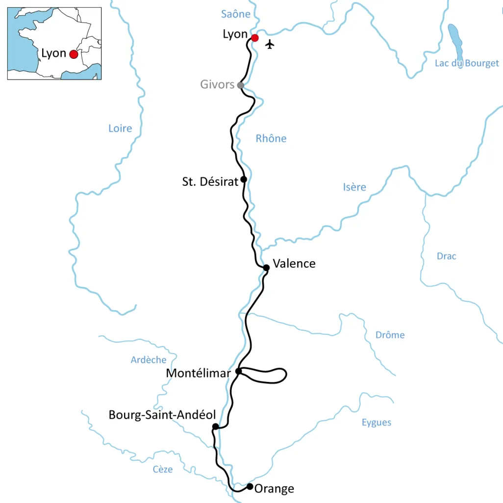 Auf dem Weg in Richtung Süden passieren Sie heute zunächst den Zusammenfluss von Rhône und Saône. Den Windungen der Rhône folgend, erreichen Sie Vienne. Die Stadt konnte sich in ihrer langen Geschichte ein reiches architektonisches Erbe bewahren. Dazu gehören der Tempel des Augustus und der Livia und das römische Theater. Kaum haben Sie die Stadt hinter sich gelassen, kommen die Weinberge der Côtes du Rhône in Ihr Blickfeld. Probieren Sie in Ihrem Etappenziel einen fruchtigen Rotwein aus einer der bekanntesten Weinregionen Frankreichs. Möchten Sie die Etappe aufgrund des hohen Verkehrsaufkommens in Lyon abkürzen, empfehlen wir eine kurze Bahnfahrt (nicht inkludiert) bis Givors.