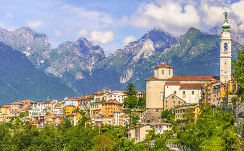 Von Pieve di Cadore radeln Sie weiter durch die eindrucksvollen Alpenlandschaften dieser Dolomitenregion. Der Weg führt südwärts über Longarone, eine Stadt, die nach dem tragischen Erdrutsch am Monte Toc 1963 vollständig neu aufgebaut wurde. Bald erreichen Sie Belluno – eine ruhige, charmante Stadt – und fahren weiter durch Wälder und idyllische Dörfer. Ihr Ziel ist Feltre, eine historische Stadt mit Blick auf die majestätischen Dolomiten.