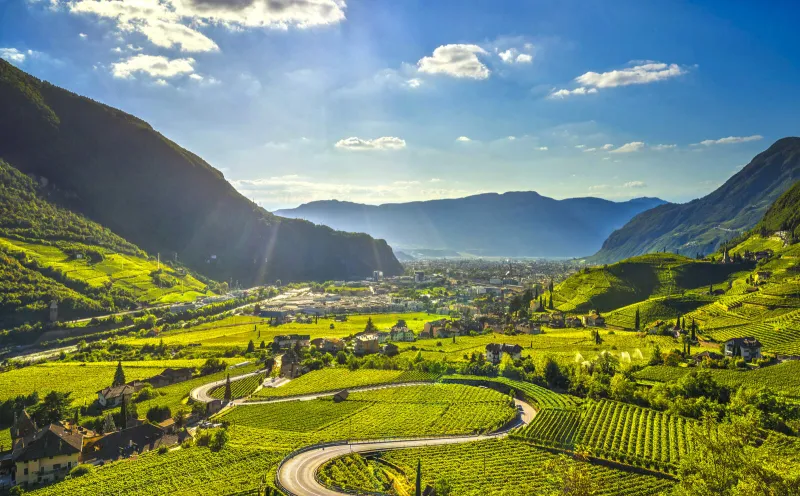 Ab Trient folgen Sie dem Radweg entlang der Etsch, vorbei an Weinbergen und Obstgärten. Sie erreichen die Salurner Klause, die Sprachgrenze zwischen Trentino und Südtirol. Weiter entlang des Flusses gelangen Sie nach Bozen, dem kulturellen und wirtschaftlichen Zentrum Südtirols, wo die Etappe endet.