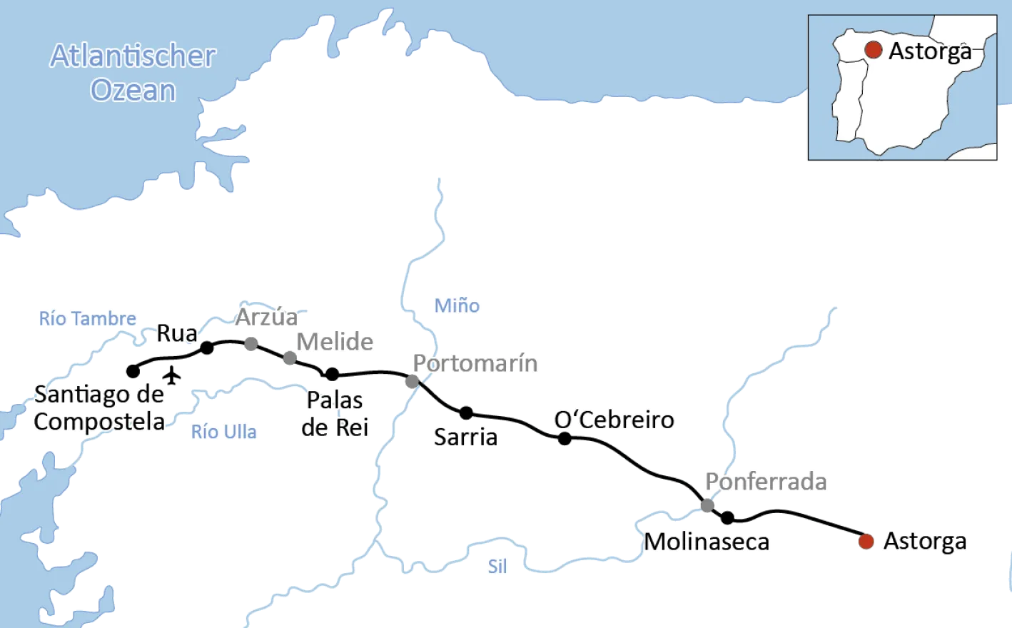 Die Radtour auf dem Jakobsweg führt Sie auf dem berühmtesten christlichen Pilgerweg von Astorga nach Santiago de Compostela. Die Etappen durch Galizien, das grüne Spanien, sind anspruchsvoll, aber voller Geschichte. Es geht für Sie durch Weingebiete, die von der UNESCO als Weltkulturerbe ausgezeichnete Kulturlandschaft Las Médulas sowie natürlich am Ende das weltberühmte Santiago de Compostela, das Ziel, aller Pilger auf dem Camino Francés.