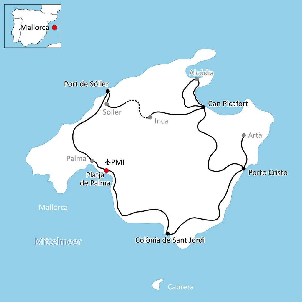 Die größte der Balearischen Inseln steht im Mittelpunkt unserer Radtour auf Mallorca. Die vor Vielfältigkeit und Lebensfreude nur so strotzende Insel wird Sie ab dem ersten Tag begeistern. Lernen Sie Mallorca fernab überfüllter Strände und Touristen-Hochburgen kennen. Der Startort unserer Radtour auf Mallorca ist Playa de Palma. Als Ortsteil der Inselhauptstadt Palma ist der gleichnamige Strand bis über die spanischen Landesgrenzen hinaus bekannt. Entlang der Küste erradeln Sie sich die Siedlung von Capocorb Vell und die Salinenfelder rund um Colònia Sant Jordi. Die Drachenhöhlen von Porto Cristo und die Perlenstadt Manacor sind ebenso Highlights unserer Radtour auf Mallorca wie ein Abstecher ins Tramuntana-Gebirge.