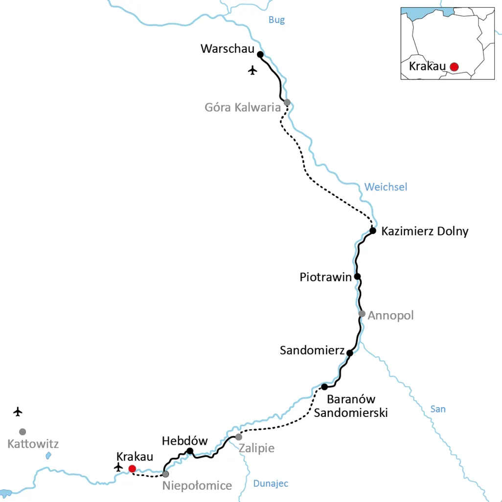 Die Weichsel ist mit ihren 1050 Kilometern der längste Fluss Polens und bietet ideale Voraussetzungen für eine Radtour in Polen. Ihr Ausgangspunkt Krakau ist mit 765.000 Einwohnern Polens zweitgrößte Stadt. Eine Stadtführung bringt Sie dieser faszinierenden Metropole näher. Unterwegs auf dem Fahrrad, besuchen Sie geschichtsträchtige Orte wie die mittelalterliche Stadt Sandomierz und den Palast von Baranów Sandomierski. Zwischendrin radeln Sie immer wieder durch die landschaftlich reizvollen Weichsel-Auen und erleben die artenreiche Tier- und Pflanzenwelt an einem der letzten unveränderten Flüsse Europas. Am Ende Ihrer Radtour in Polen erwartet Sie das kontrastreiche Warschau. Die Stadt blickt auf eine bewegte aber auch tragische Geschichte zurück. Doch gerade dieser Aspekt macht ihren Reiz aus! Geeignet ist diese Radtour in Polen besonders für Radler, die Polen gern als Reiseland entdecken und die ursprüngliche Landschaft sowie die historische Vielfalt entlang der Weichsel kennenlernen möchten.