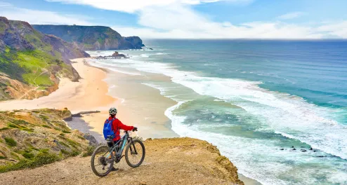 Am vierten Radtag erreichen Sie die Westküste Portugals. Entlang des Flusses Mira radeln Sie durch Himbeer- und Süßkartoffelfelder auf ruhigen Wegen durch das Naturschutzgebiet der Costa Vicentina. In Porto das Barcas genießen Sie den Blick auf den Atlantik und können frische Meeresfrüchte probieren. Weiter geht es nach Zambujeira do Mar mit der Kapelle Nossa Senhora do Mar und traumhaften Stränden. Die Route führt entlang der Ribeira de Seixe mit schönen Ausblicken bis zur Mündung ins Meer. Schließlich erreichen Sie Aljezur, wo die Burgruine mit fantastischem Panorama und die regionalen Süßkartoffelgerichte auf Sie warten.