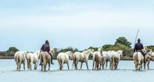 Heute führt Sie Ihre Radtour in die Camargue – das bekannte Mündungsgebiet der Rhone. Eine einzigartige Schwemmlandschaft hat sich hier an der Grenze von Land und Meer gebildet, die vielen Pflanzen und Tieren Lebensraum bietet. Sie können die berühmten weißen Pferde, schwarzen Stiere und rosa Flamingos in ihrer natürlichen Umgebung beobachten. Saintes-Maries-de-la-Mer ist ein alter Wallfahrtsort, der schon Vincent van Gogh begeisterte.