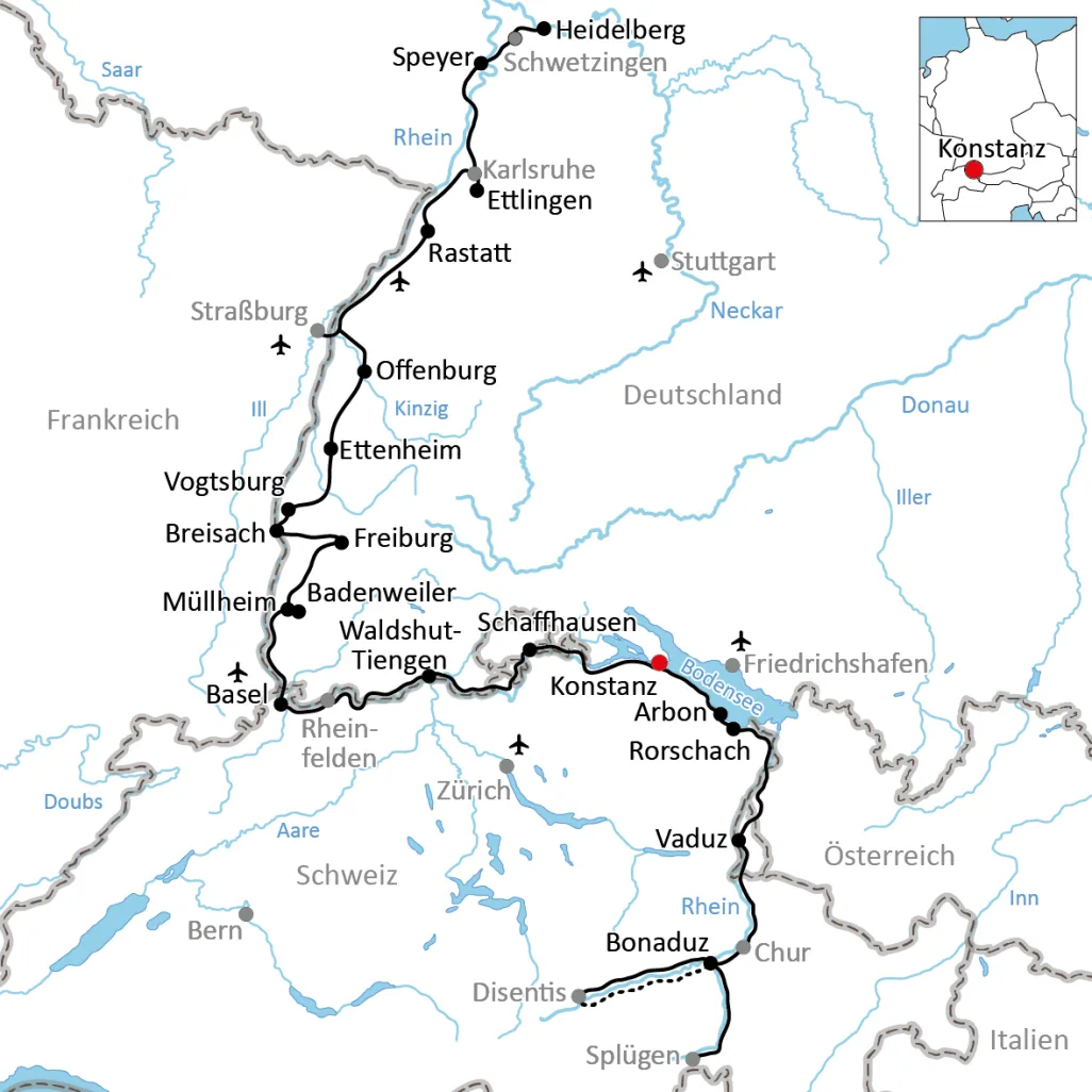 Willkommen zu unserem Radurlaub am Rhein! Auf dieser 3-wöchigen Tour erleben Sie zwischen der Rhein-Quelle in der Schweiz und Heidelberg im Norden Baden-Württembergs einen der eindrucksvollsten Flüsse Europas. Sie starten in Konstanz am Bodensee. Per Transfer geht es in den Süden der Schweiz, wo Sie unweit der Rhein-Quelle zu Ihrer ersten Radetappe starten. Sie lernen auf unserem Radurlaub am Rhein beeindruckende Schluchten und Naturschauspiele entlang des Vorder- und Hinterrheins kennen, statten dem Fürstentum Liechtenstein einen Besuch ab und erreichen entlang des Bodensee-Ufers den Hochrhein. Sie erradeln sich den Rheinfall bei Schaffhausen sowie die Kunststadt Basel, bevor Sie das von Weinbergen geprägte Markgräflerland rund um Müllheim und Badenweiler erkunden. Mit der Bächle-Stadt Freiburg erreichen Sie das Breisgau, welches gleichermaßen sonnenverwöhnte badische Weine hervorbringt und zum Genuss des einen oder anderen Tropfen einlädt. Ebenso kommen Sie in den Genuss elsässischer Weine bei einem Ausflug nach Colmar. Über die Barockstadt Ettenheim gelangen Sie nach Offenburg. Ein Ausflug ins nahe gelegene Straßburg ist der Startschuss für die letzten Etappen unseres Radurlaubes am Rhein entlang des Oberrheins. Über Karlsruhe und die alte Kaiserstadt Speyer erreichen Sie schließlich Ihr Reiseziel Heidelberg. Entspannt geht es mit einem Transfer zurück an den Bodensee nach Konstanz.