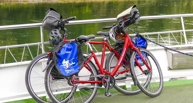 Trotz eines kurzen Schreckmoments – SIE war bei der Anreise bei einem Spaziergang gestürzt und hatte sich am Knie verletzt – übernahmen wir tags darauf voll freudiger Erwartung unsere bestellten Räder in Konstanz. Ohne schmeicheln zu wollen – wir fühlten uns von Anfang an bestens betreut! Nicht bloß der nette Empfang ist erwähnenswert, auch ein kurzfristig erwünschter Radwechsel wurde problemlos durchgeführt, und so ging es nach einer Nacht im sehr schönen Hotel Halm tatsächlich los.
