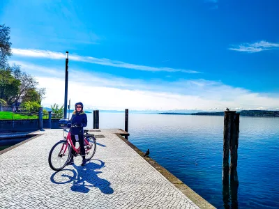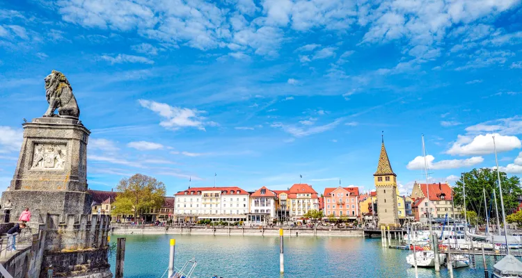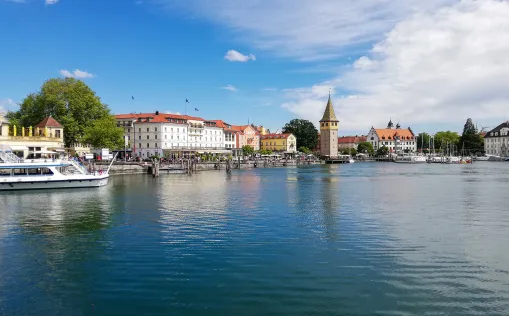 Wir starteten voller Tatendrang in den Tag. Nach einem herzhaften Frühstück radelten wir durch die deutsche Landschaft. Ein Stopp in einem wunderschönen Blumenfeld war für Fotos ein Muss! Und dann erreichten wir Lindau – eine Stadt auf einer Insel, die wie aus einem Märchen entsprungen ist! Die Hafeneinfahrt mit dem Leuchtturm und dem Löwen ist ikonisch, und die Kopfsteinpflasterstraßen, niedlichen Geschäfte und Cafés sind bezaubernd. Wir genossen den Ort mit Mate und Apfelstrudel, bevor wir weiterfuhren.