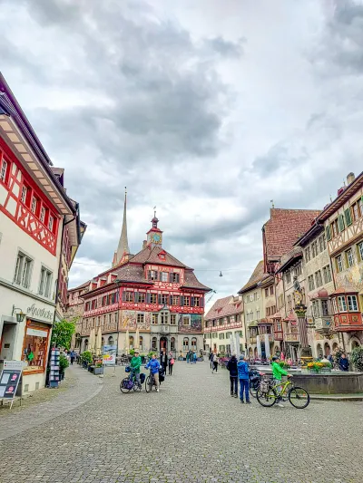 Der Weg führte weiter entlang des Rheins, und die Landschaft wurde abwechslungsreicher und malerischer. Wir erreichten die mittelalterliche Stadt Stein am Rhein, ein echtes Juwel, wo wir uns am Fluss entspannen konnten, bevor wir die märchenhaften Straßen erkundeten. Die letzte Etappe nach Schaffhausen war wunderschön und führte durch Wälder, vorbei an Bauernhöfen (mit dem Klang von Kuhglocken!) und alten Brücken. Die Ankunft in Schaffhausen erforderte einen letzten Anstieg, aber es lohnte sich, um ein ausgezeichnetes Hotel zu erreichen und ein beeindruckend gut erhaltenes und malerisches historisches Zentrum zu entdecken!